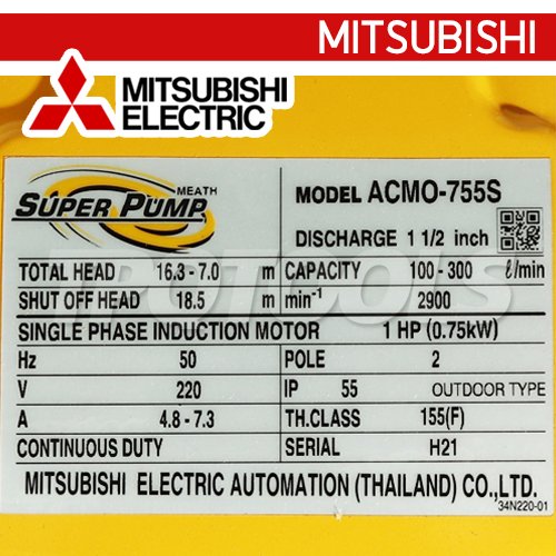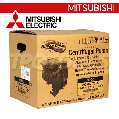 ACMO-755S (220V) ปั๊มน้ำหอยโข่ง ชนิดแรงดันสูงปานกลาง (ใบพัดกึ่งเปิด) ท่อ 1-1/2" x 1-1/2" แรงม้า 1HP 220V กำลังส่งสูง 16.3-7.0 ม. MITSUBISHI